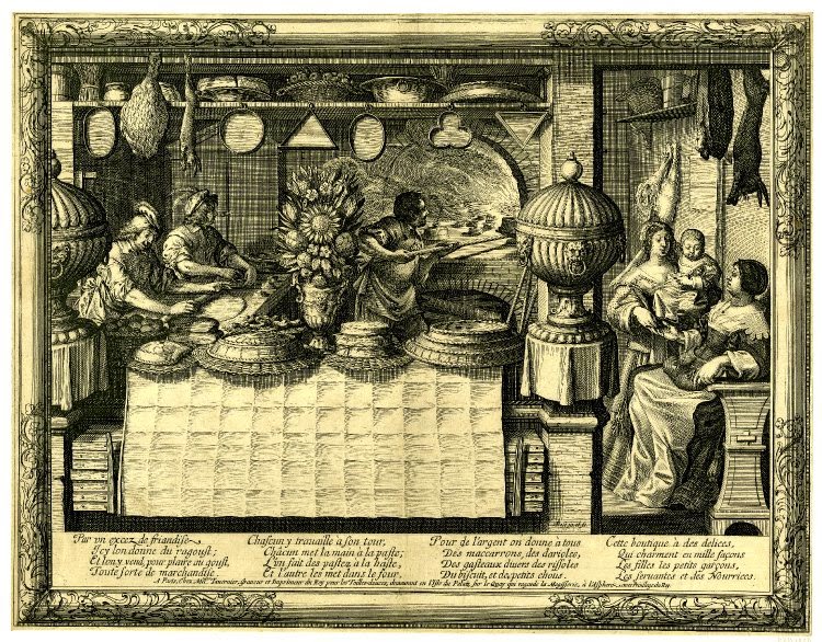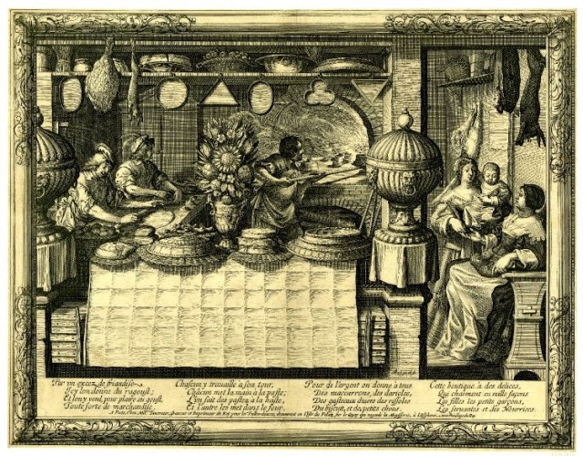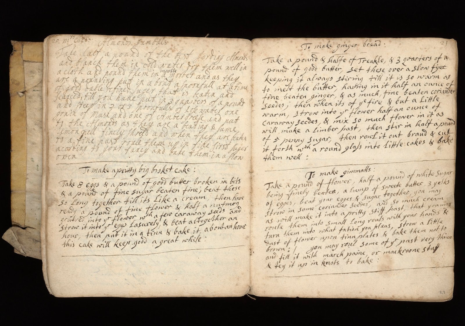 Cake in the seventeenth century did not, on the whole, come as a snack, but rather, as part of a course at dinner in which multiple dishes would be set forth. A menu from a 1594 recipe book, “The Good Huswife’s Handmaid for the Kitchen”, gives the somewhat exotic guidance for a two-course dinner as: