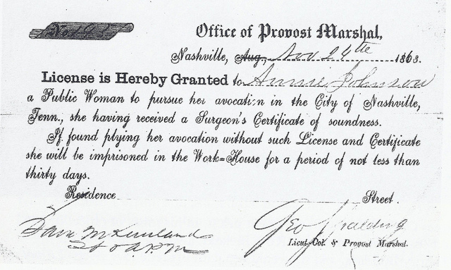 Finally, in an attempt to regulate the spread of disease, a referendum was passed where prostitutes had to be examined, declared disease free, treated and given a license to practice their trade. The Union Army in Nashville established the United States’s first system of legalized prostitution.